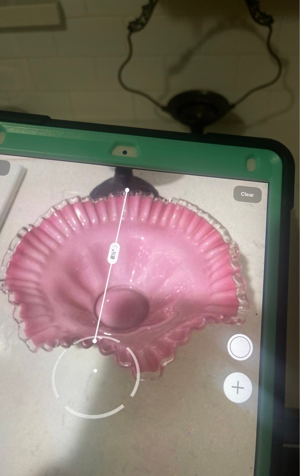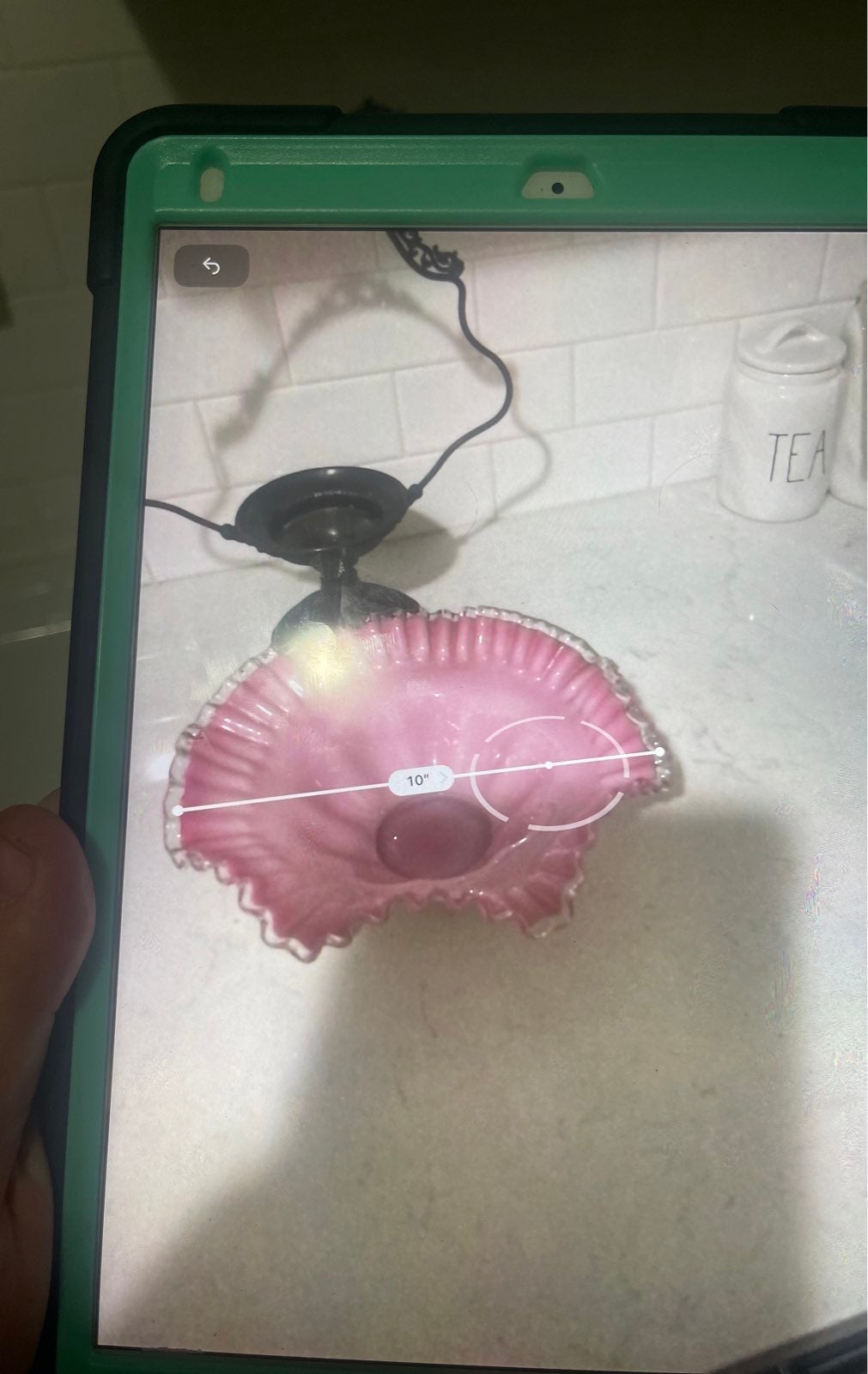 I’m sorry I tried my best with Measure it , because I don’t have a measuring tape . so I used my iPad and I did my best lol —- so that’s the size I believe it is / measurements this is absolutely stunning it’s the milk glass underneath the pink - it seems to be perfect condition- The Brass believe needs to be polish but I don’t know how
