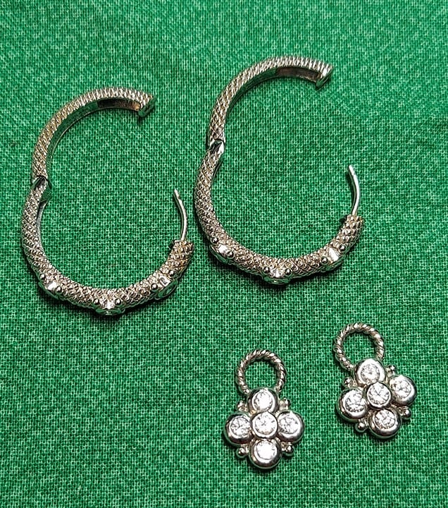 Great versatility comes with these beautifully textured hoops and Diamonique embellished charms designed by Judith Ripka. Hoops each have three (3) bezel set round white Diamonique CZs and can be worn alone or add the sparkly Diamonique CZ flower charms for an extra dose of bling! White 3mm round Diamonique CZs in a cluster of five (5) create each perfect flower charm, which also have twisted textured loops enabling them to hang from the hoops, or even one of your own chains... or two? Charms are always versatile! The crisscross dotted texturing of the hoops delivers a fun visual, as well as a tactile experience. Hoops and charms are in excellent LIKE NEW condition, with all stones intact. Hallmark: "JUDITH RIPKA 925 CZ THAILAND." Weight 11.9g. Please see all photos which are also considered to be an important part of the description. Photo props not included.