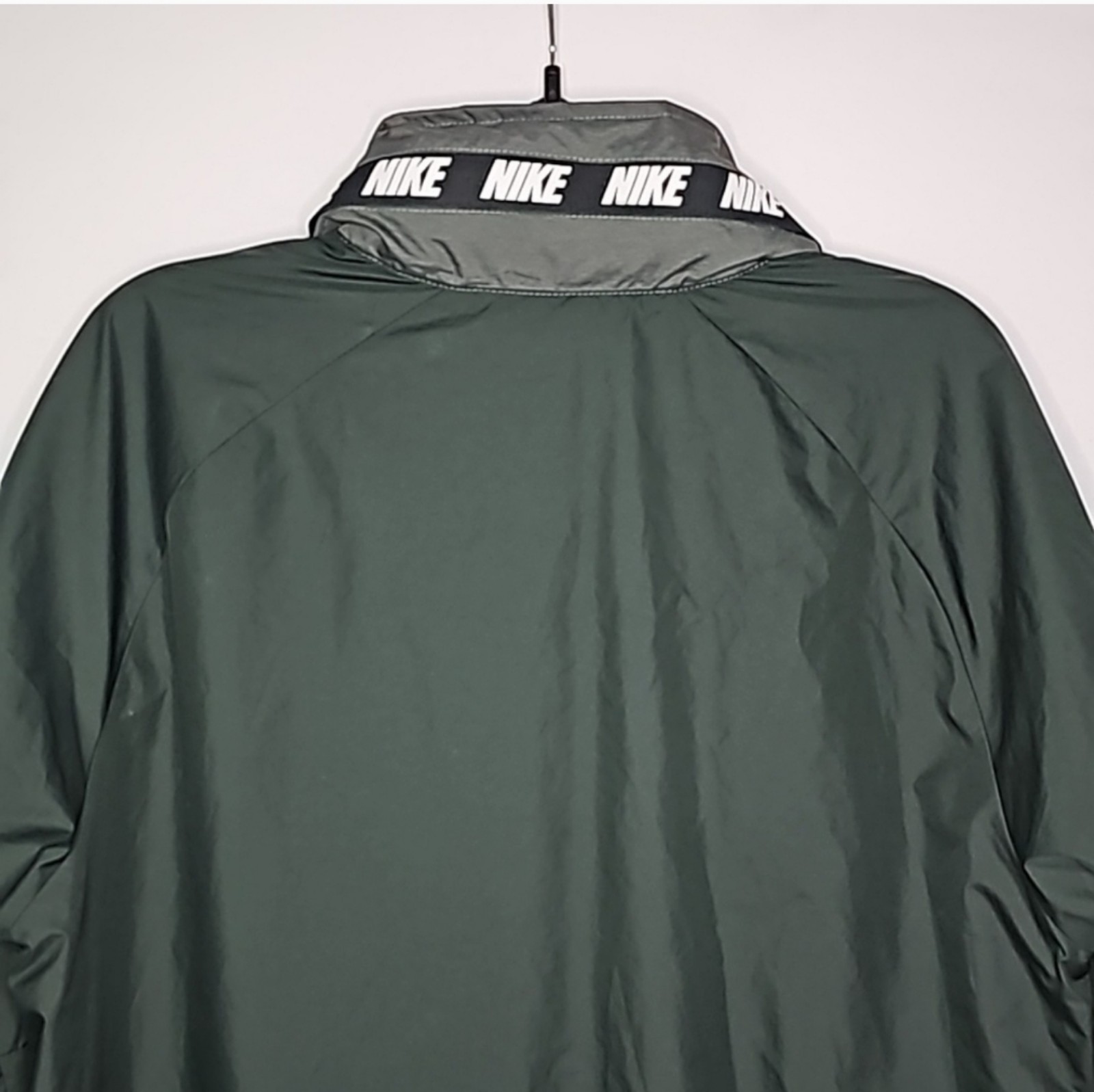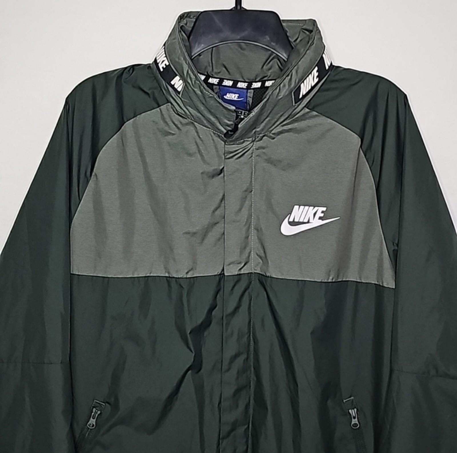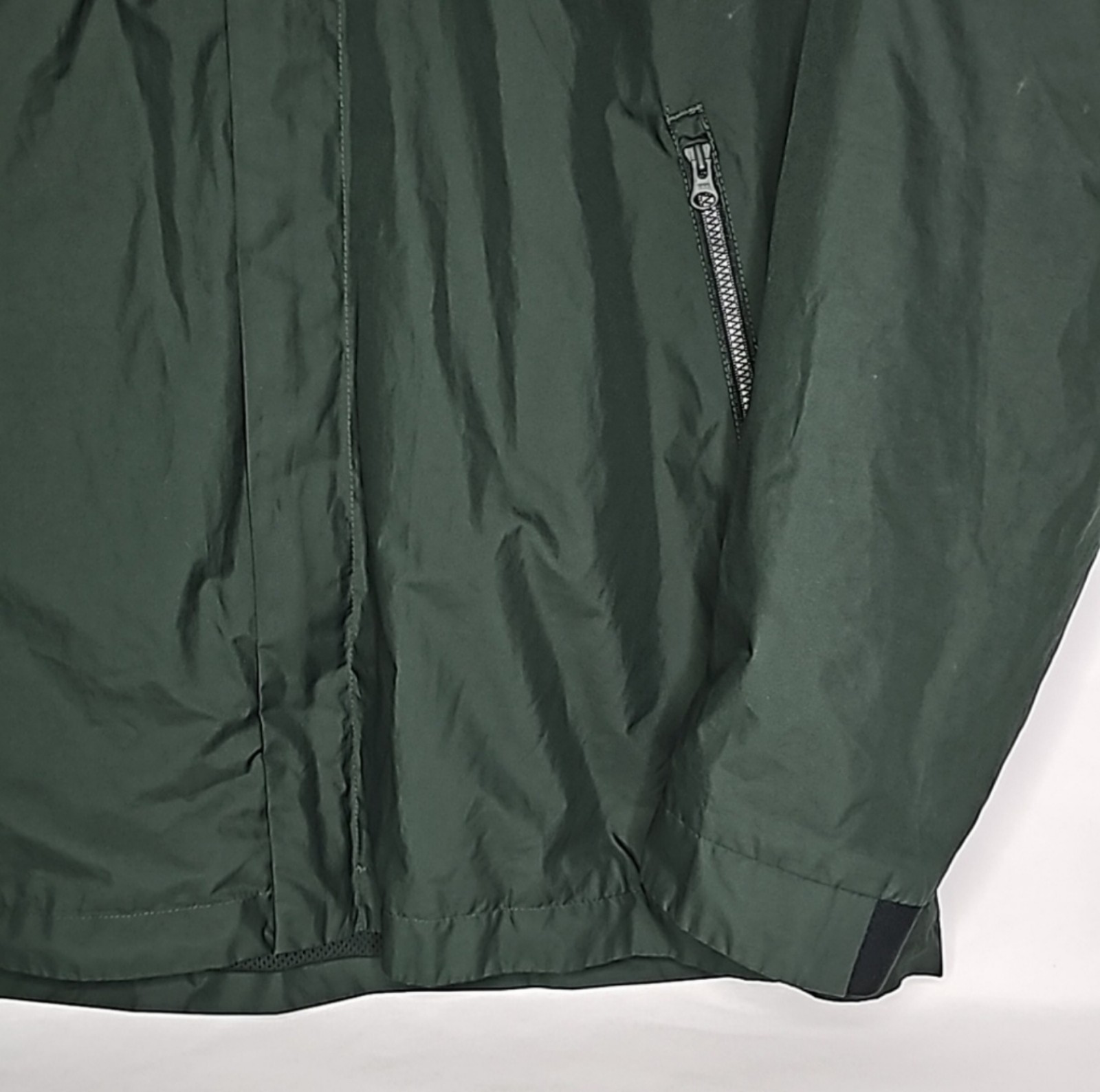 Like New! Men's forest green windbreaker/track jacket. Lightweight, mesh lined, full-zip, front zip pockets, and drawstring hood that folds up easily into zipped collar.