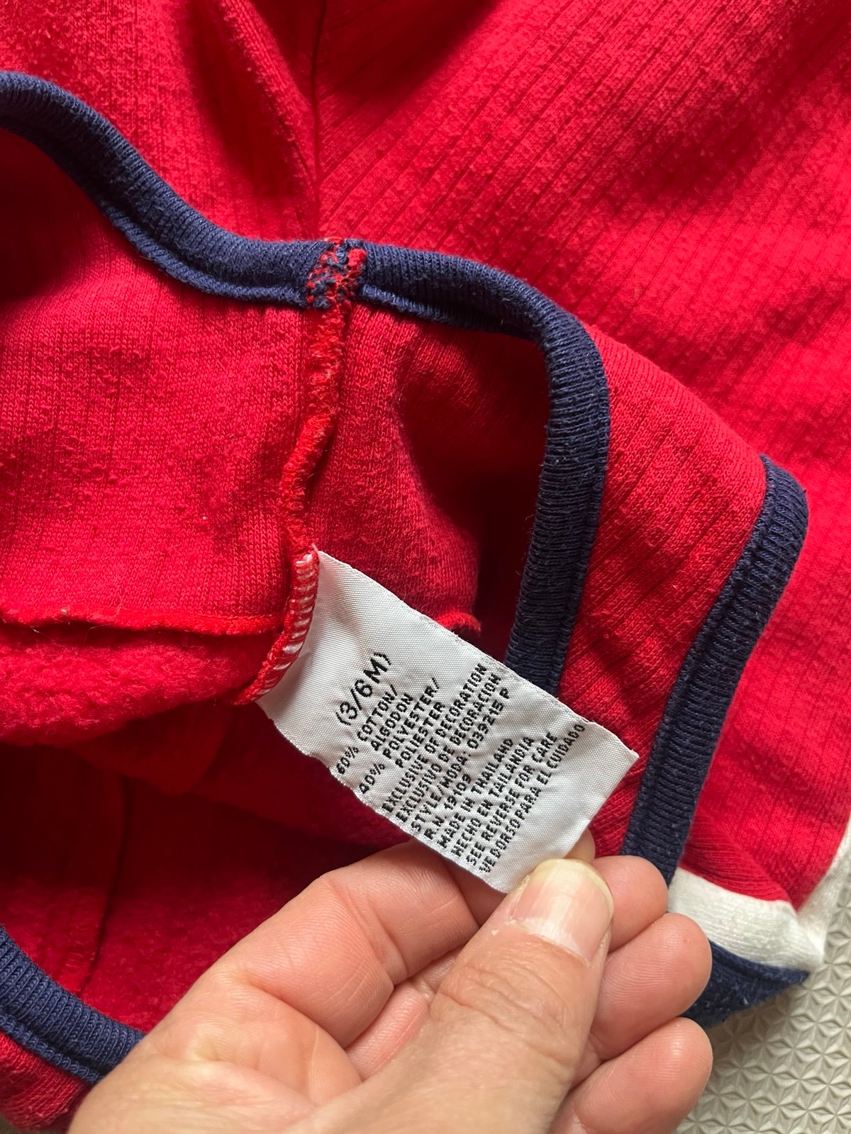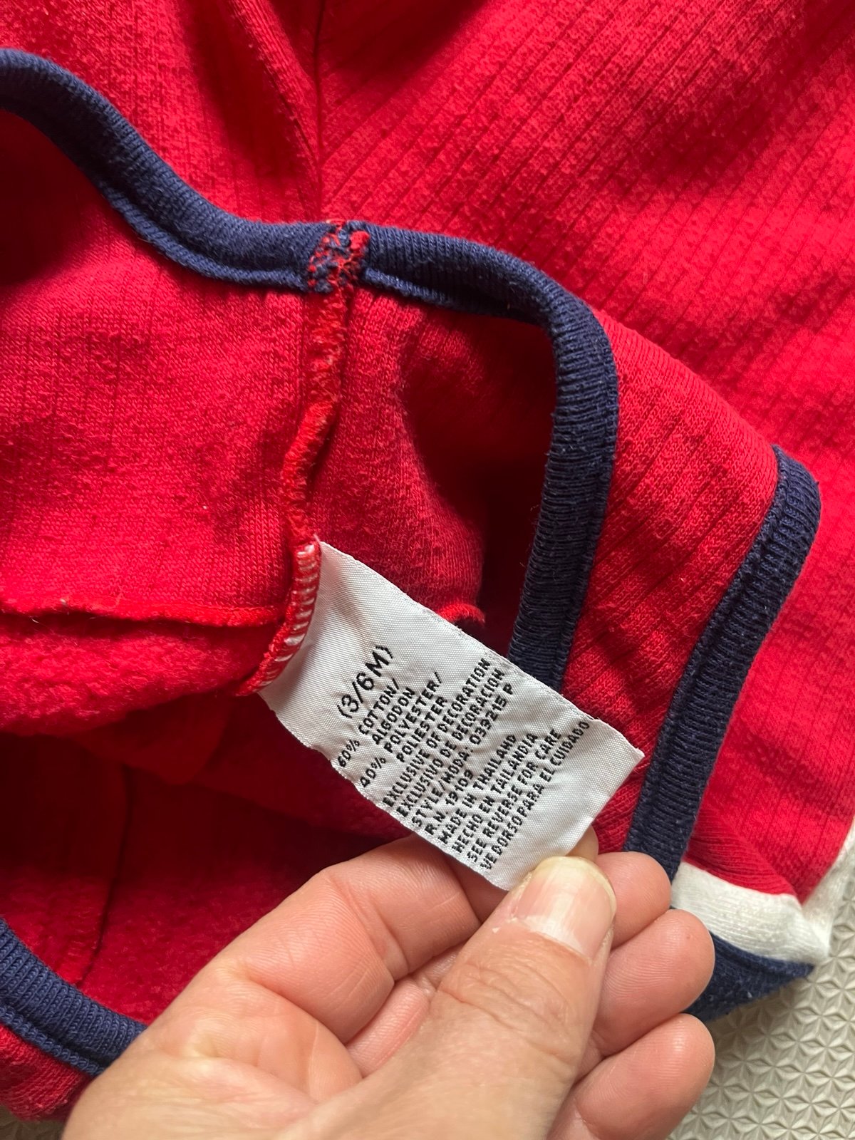 Excellent condition detailed baby Pooh overalls, red with blue and white stripes down side, baseball Pooh bear and Tigger embroidered with the words Baseball Buddies. The fabric has a textured stripe and they are a pretty thick, warm soft fleece. Colors are vibrant. Little kangaroo pouch pocket at front. Some very slight pilling / wash wear. It’s a rarer type Pooh baby overalls. Adorable.