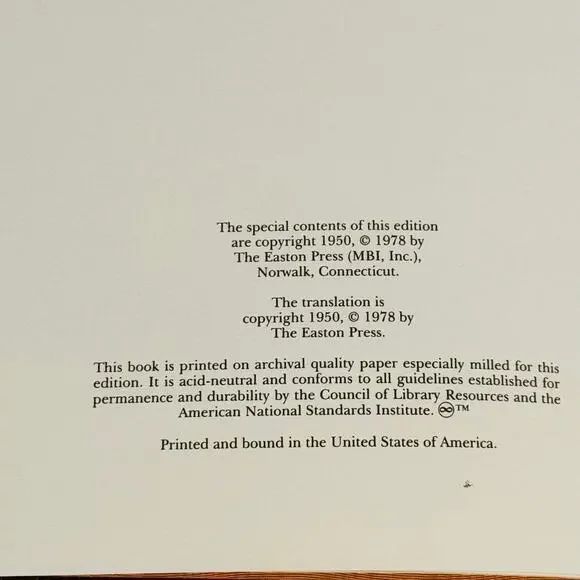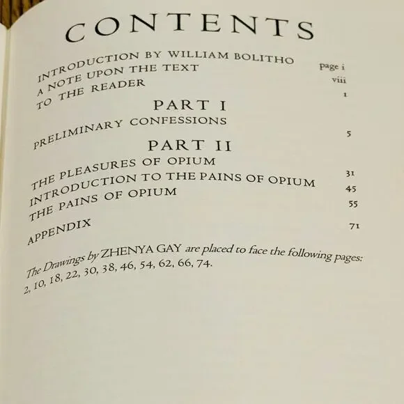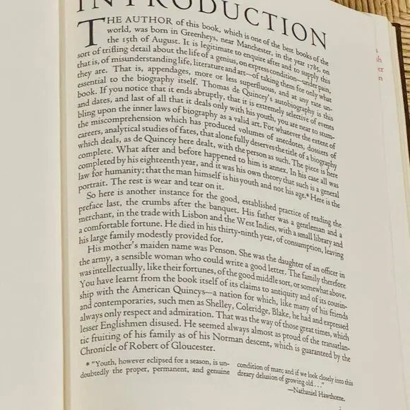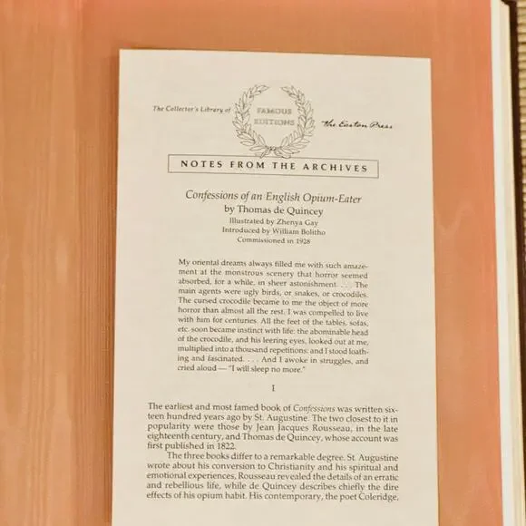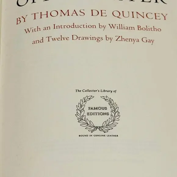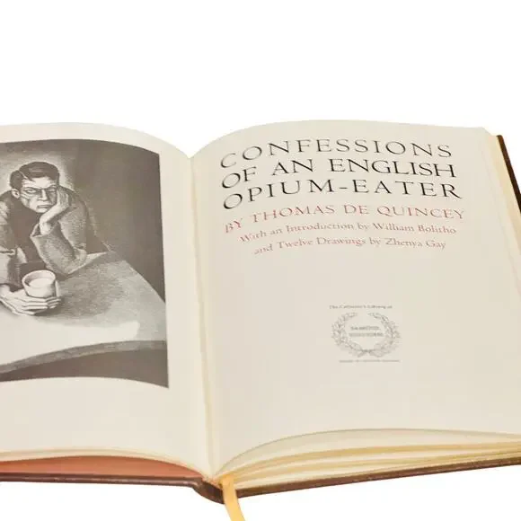 Author: Thomas De QuinceyPublisher: The Easton Press – Collector’s Library of Famous EditionsCopyright: 1950, 1978Confessions of an English Opium-Eater is Thomas De Quincey’s groundbreaking autobiographical account of his addiction to opium and its effects on his mind and body. First published in 1822, the work blends introspective memoir, psychological exploration, and vivid dreamlike passages, offering an early literary glimpse into substance dependence and altered consciousness.This beautiful Easton Press edition of Confessions of an English Opium-Eater is bound in genuine brown leather with ornate 24k gold embossing on the cover and spine. Part of the Collector’s Library of Famous Editions, this 1978 edition features:•Introduction by William Bolitho•12 striking lithographic illustrations by Zhenya Gay•Archival-quality acid-neutral paper•Gold gilded page edges•Satin ribbon bookmark•Smyth-sewn binding for lasting durability•Printed and bound in the USACondition: Excellent – minor shelf wear, pages clean and crisp. Includes original ex libris plate (signed by previous owner).A fine collectible for Easton Press enthusiasts, literary collectors, or fans of classic English literature.Ships securely with care.