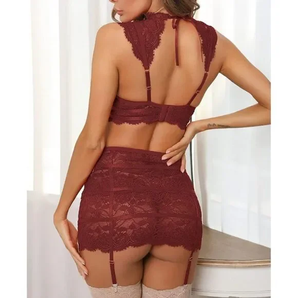 ====NEW====🎀 Hook and Eye closureThis seductive garter belt set features a collared bustier and a garter skirt with G-string (stockings not included)🎀 Lace garter skirt has strappy details and attached garter clips and adjustable straps matching g-string, perfectly show your elongated legs' line, sexy and provocative_____Don’t hesitate to offer me NOW!______