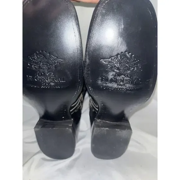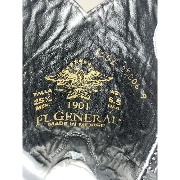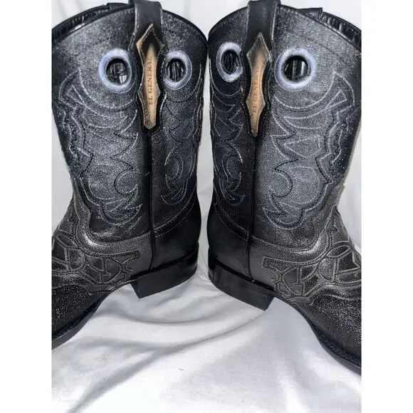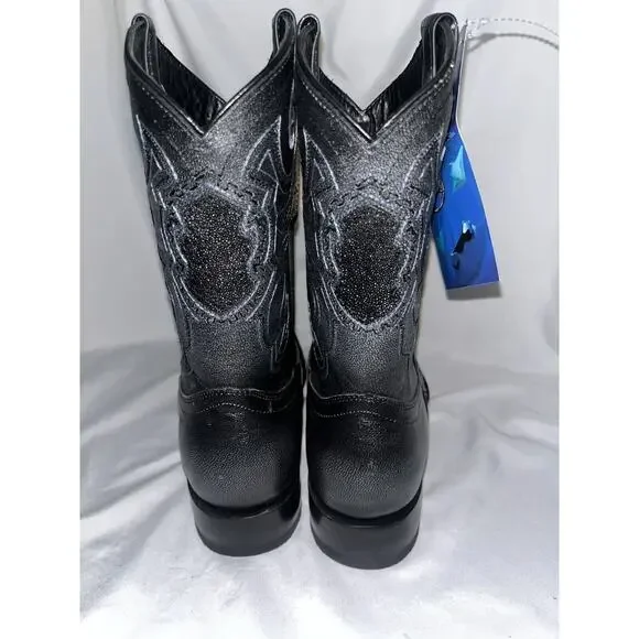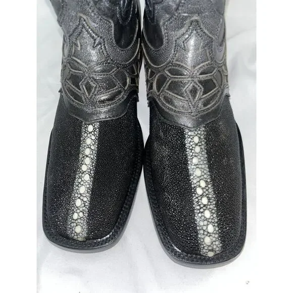 These are exotic black genuine stingray leather Western cowboy boots with a square toe shape. They are handcrafted in Mexico by El General and feature a unique male stingray pattern. The boots are mid-calf in height, have a pull-on closure, and a leather lining and insole. The rare and limited edition design is in a size 6.5 for men, making them a unique and luxurious addition to any wardrobe.