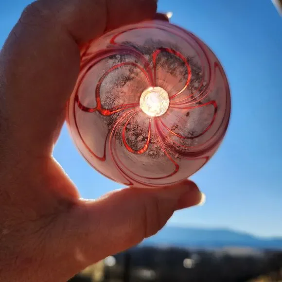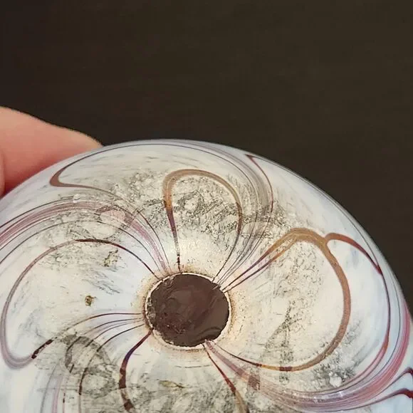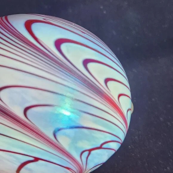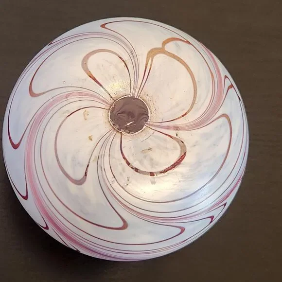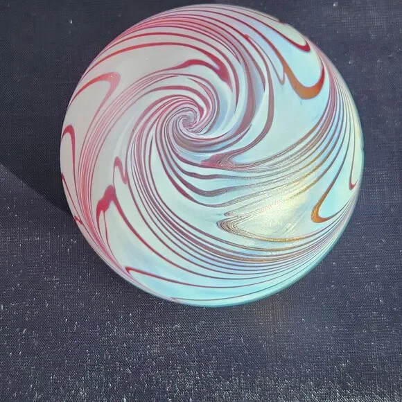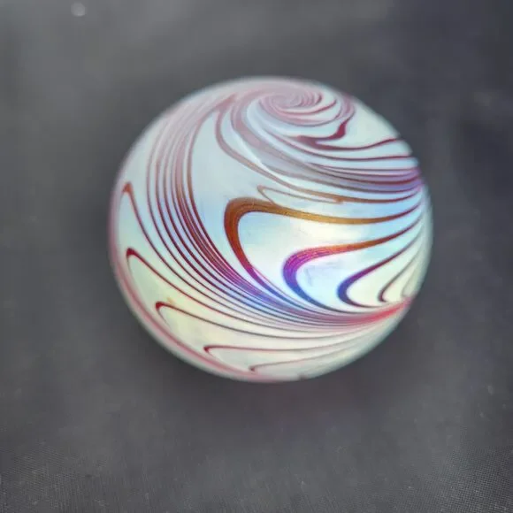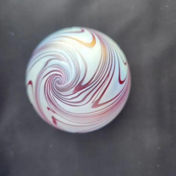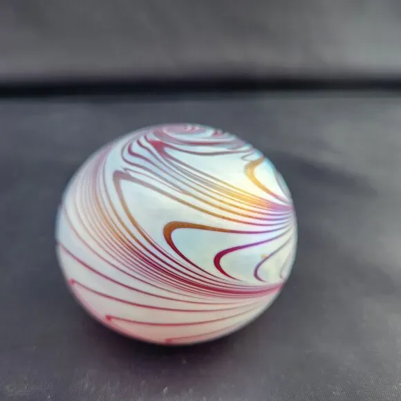 Attractive signed art glass paperweight created by Trout Studios of Staunton, VA.This was difficult to photograph because it has an iridescent lustre (these are known as lustre paperweights.)Signed but it is difficult to make out because of the pontil scar (a hallmark of their work)In the last picture I highlighted it in pencil to make it easier to see (pencil has since been removed.)The glass is cranberry pink and white, if you look closely you can see a faint pink mottling in the white as well.Approx size:2.5" h x 3" w, weighs 1 lb.Condition:Excellent, I am not seeing any defects.Keats said "A thing of beauty is a joy forever". Each of us has a different idea of what "beauty" is. I find quality vintage items and offer them to you, the beholder. Have you found your thing of beauty?