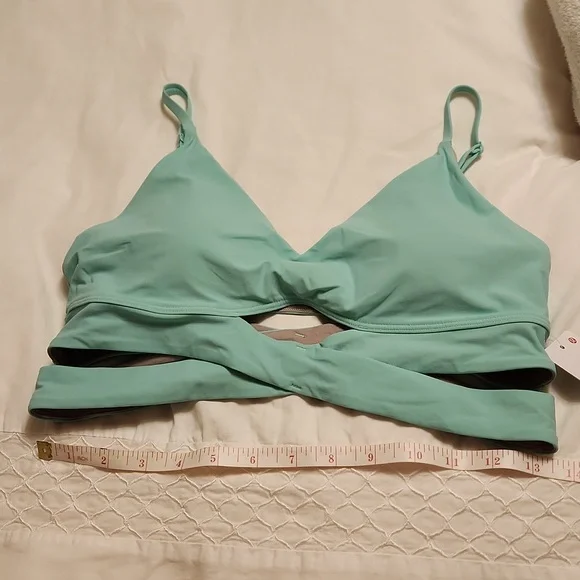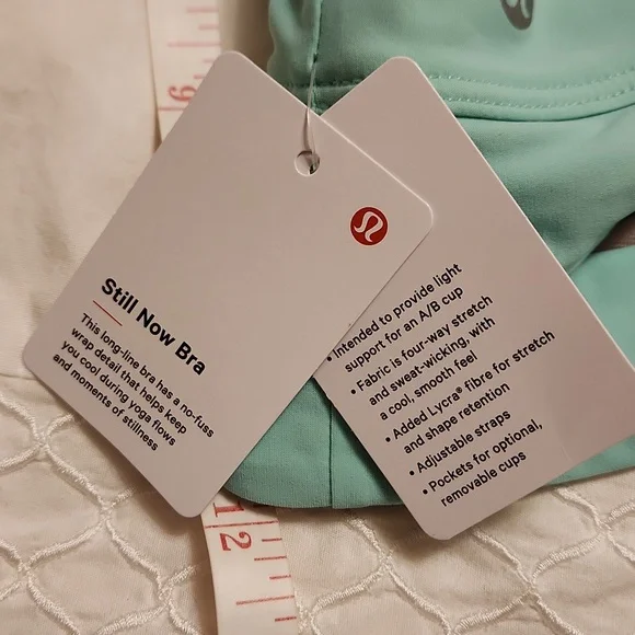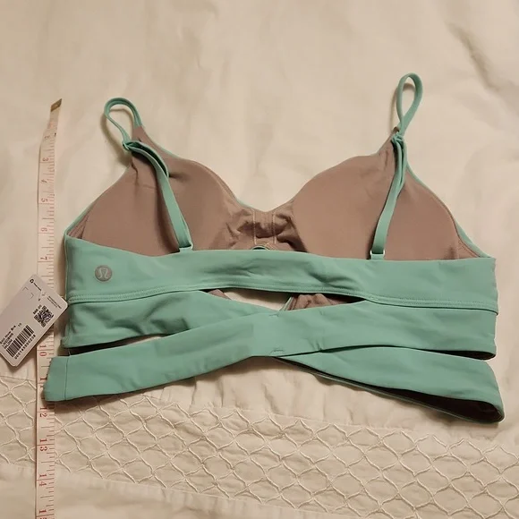 Lululemon Still Now BraColor is turqoise. First two pictures featured for style only.With a beautiful wrapped look, this long-line bra keeps you feeling cool and collected during dynamic yoga flows or reflective moments of stillness.Fabric is sweat-wicking and four-way stretchfeaturesDesigned for: YogaAdjustable straps: Adjust the straps for a custom fitCoverage: Pockets for optional, removable cupsLight support: Intended to provide light support for an A/B cup