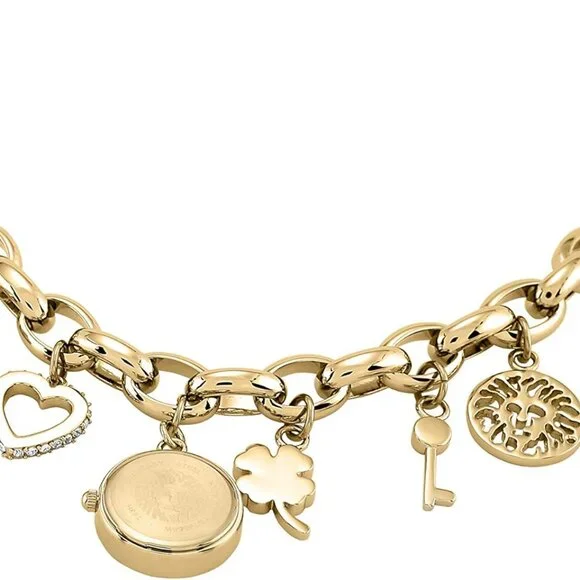 Product Dimensions: 2.91 X 3.86 X 3.15 Inches; 0.01 OuncesDepartment: WomensBatteries: 1 Product Specific Batteries Required. (Included)Charm bracelet watch with chain featuring various premium crystal-accented charms and dangling watch dial20 mm gold-tone stainless steel watch case with mineral dial windowQuartz movement with displayGold-tone link bracelet with jewelry-clasp closureAbout this item Charm bracelet watch with chain featuring various premium crystal-accented charms and dangling watch dial 20 mm gold-tone stainless steel watch case with mineral dial window Quartz movement with display Gold-tone link bracelet with jewelry-clasp closure See more About this item