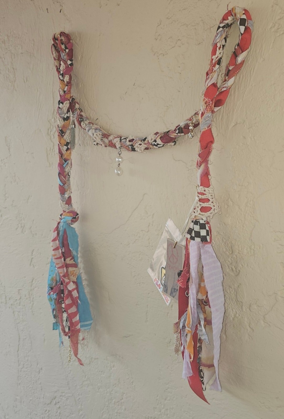 New with tags - Handmade Peacenik Kantha Rope Belt - "Wings of Light". One-of-a-kind, braided from vintage Kantha quilts + repurposed fabrics, then finished with beads, charms, and metallic accents.