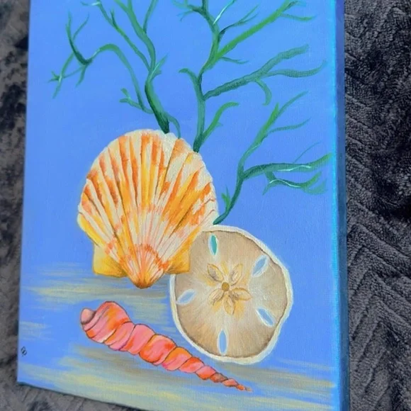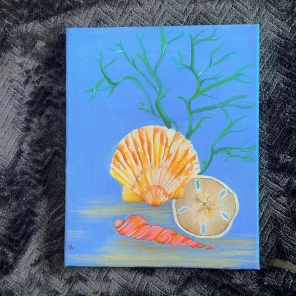 Seashell & Sand Dollar Painting8 x 10 inch canvasAcrylic paint. Blue metallic paint on the edges. Refurbished painting provides a layered & textured aspect. A gloss varnish can be applied free of charge if requested for that shiny finish :) This is part of a collection of artwork done by saving old canvases previous art students have discarded. By painting over the once abandoned work, we are able to restore a canvas & save it from the trash. xoxo 💫#Painting #Bonnaroo #SeaShell #Miami #Upcycle