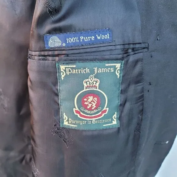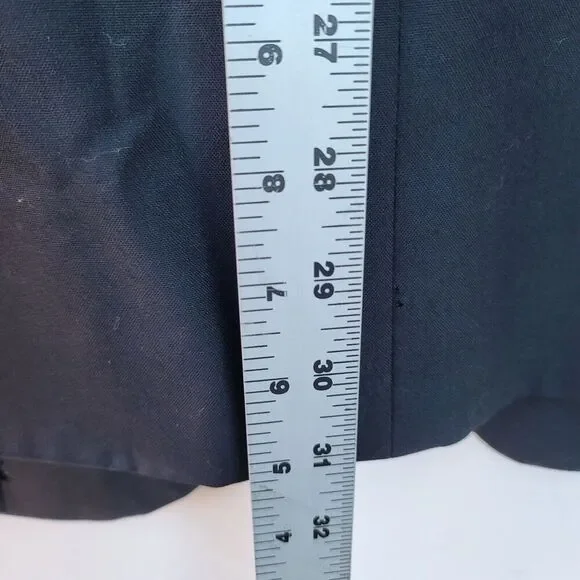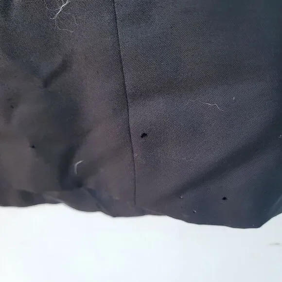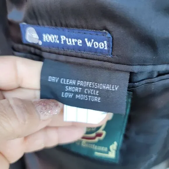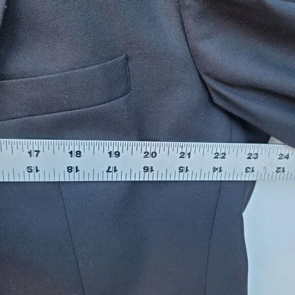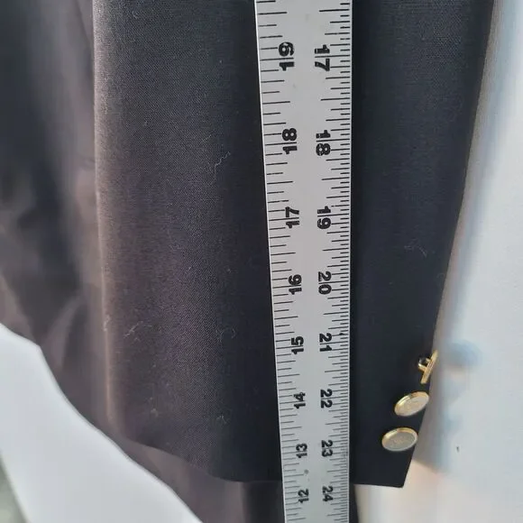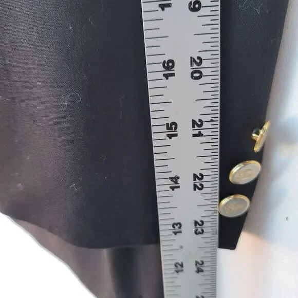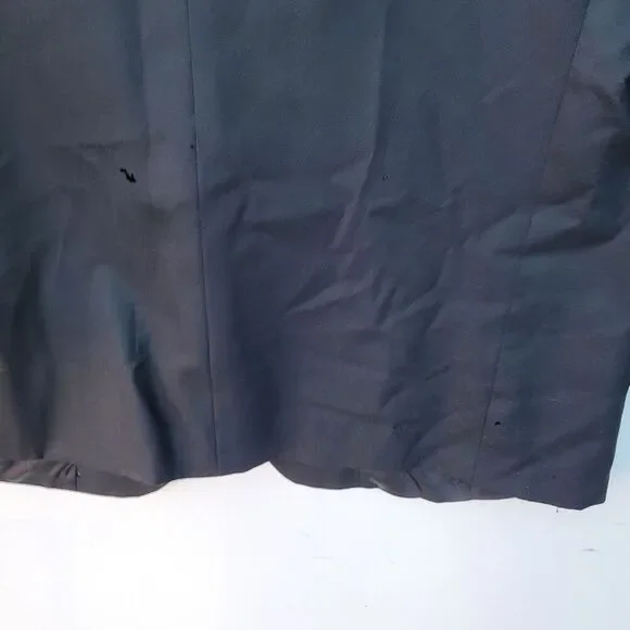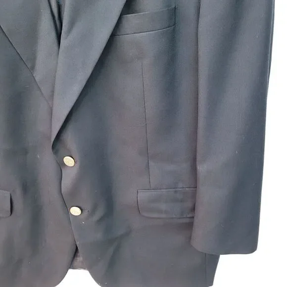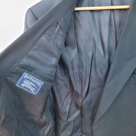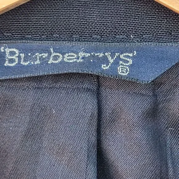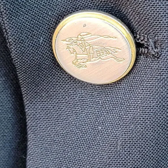 *minor tears on backside and arm of jacket shown in photos Smoke free environment This is a vintage Burberry wool blazer in size large with a black color. The blazer features two logo buttons for closure and has a mid-length design. It is lined with viscose and has a regular fit, making it suitable for various occasions including parties, formal events, and business settings. The blazer also includes shoulder pads, pockets, and is breathable, making it ideal for wear in winter, fall, and spring seasons.